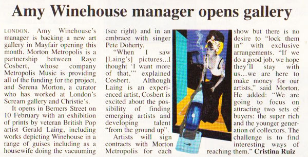 The Rehab songstrel’s manager adds another string to his bow next month as his brand new art gallery – Morton Metropolis – launches with an exhibition from pop-art legend Gerald Laing.