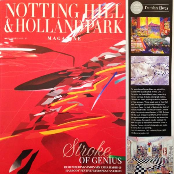‘To delve into the souls of Cézanne and Kahlo, Elwes recreated the original arrangement of furniture and atmosphere in their studios. To research how the buildings that were occupied by these artistic luminaries looked in their day, Elwes scrutinised photographs and books, as well as their own paintings’ The Notting Hill and Holland Park Magazine