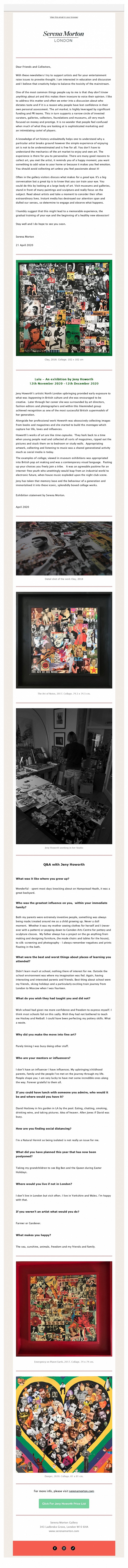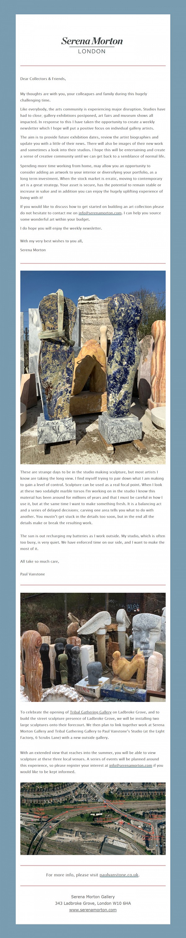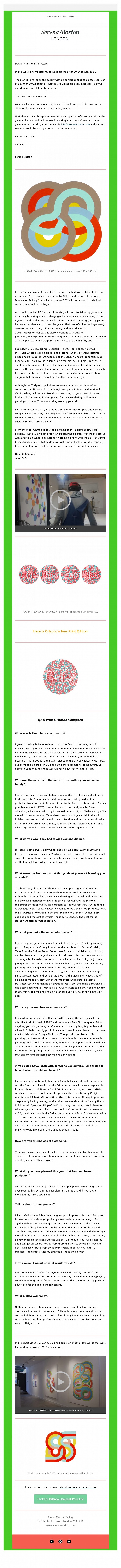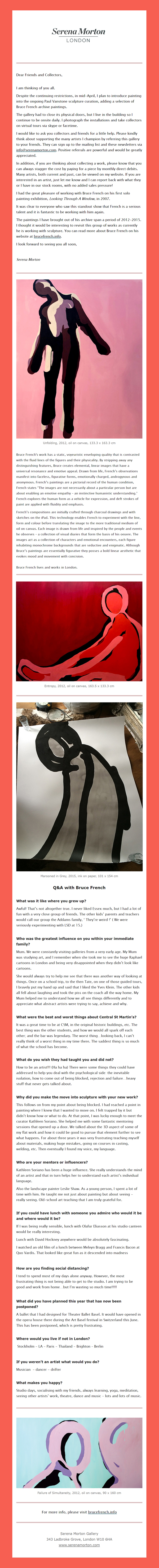 I would like to ask you collectors and friends for a little help. Please kindly think about supporting the many artists I champion by referring this gallery to your friends. They can sign up to the mailing list and these newsletters via info@serenamorton.com. Positive referrals are powerful and would be greatly appreciated.