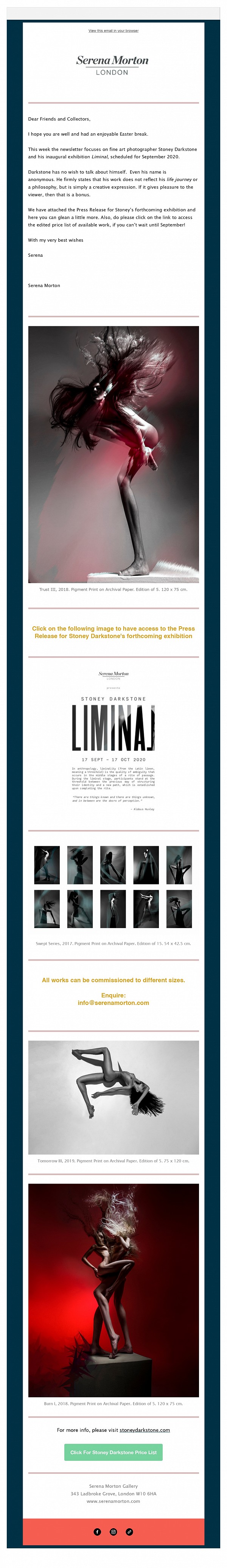 This week the newsletter focuses on fine art photographer Stoney Darkstone and his inaugural exhibition Liminal, scheduled for September 2020.